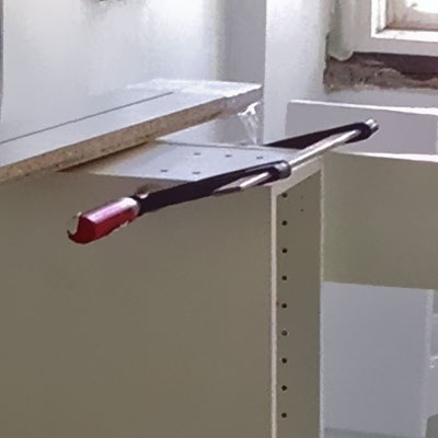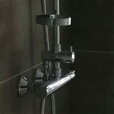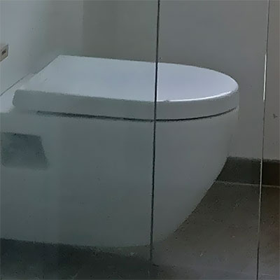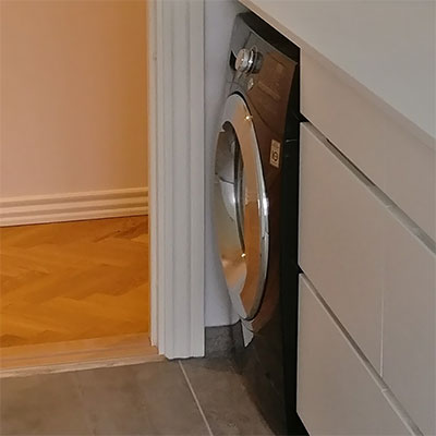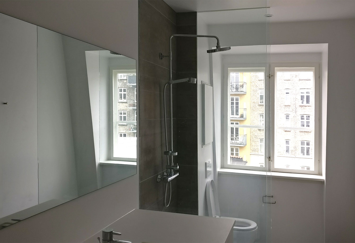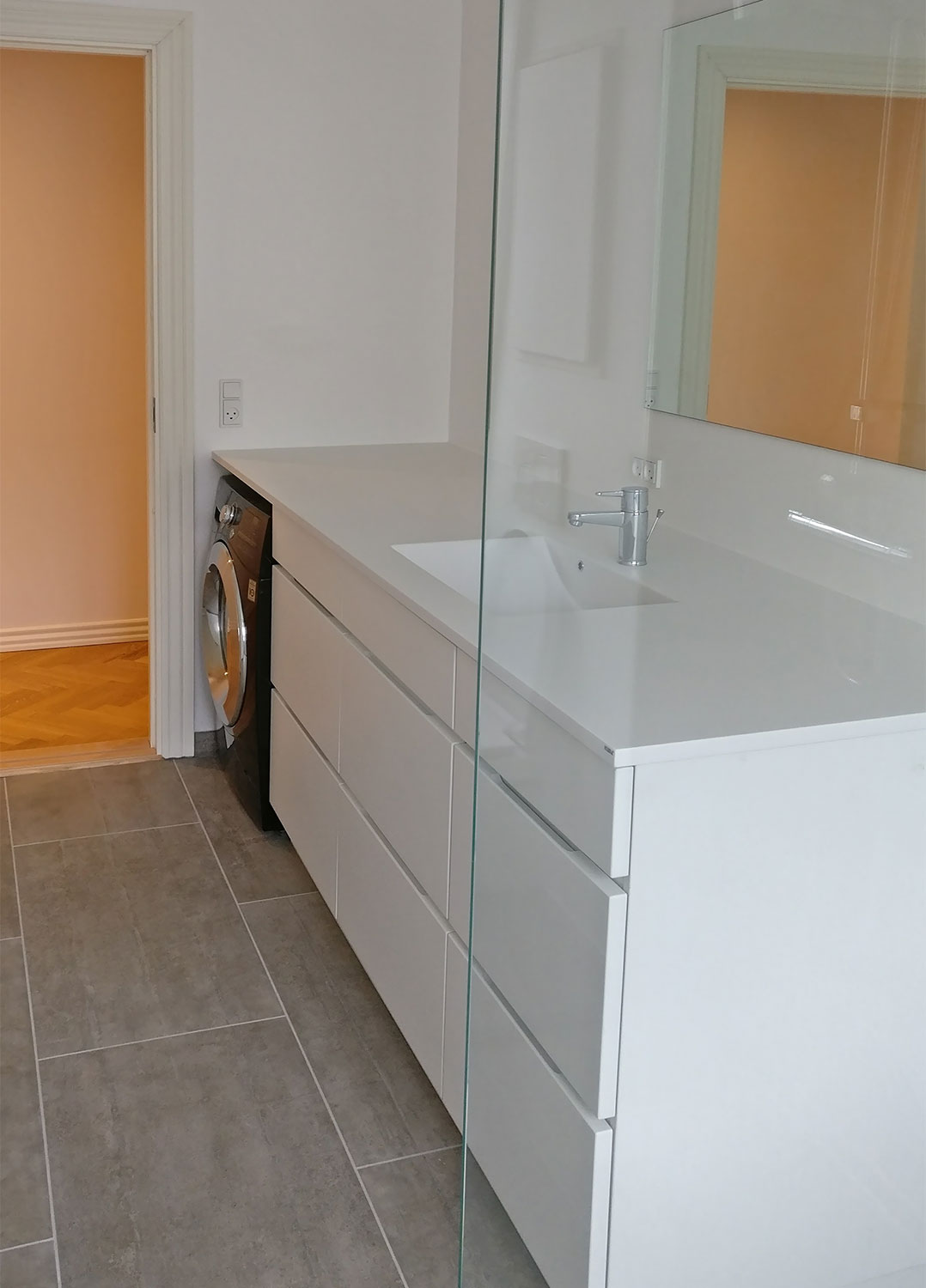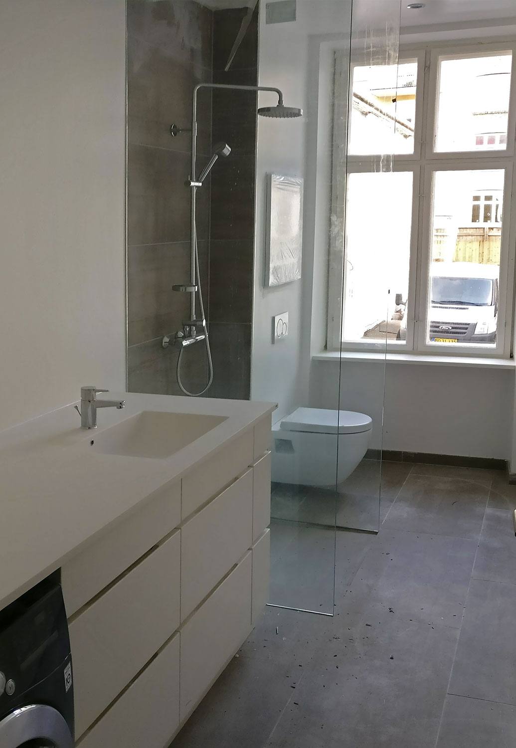 Nye badeværelser i forbindelse med renovering af ejendom. Beton-fliser med rådt look og indbygget gulvvarme. Stort badmøbel med fuldstørrelse spejl og praktisk vaske-tørremaskine.