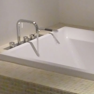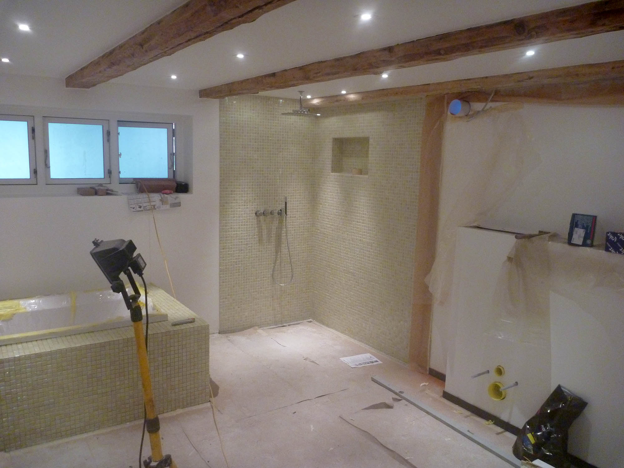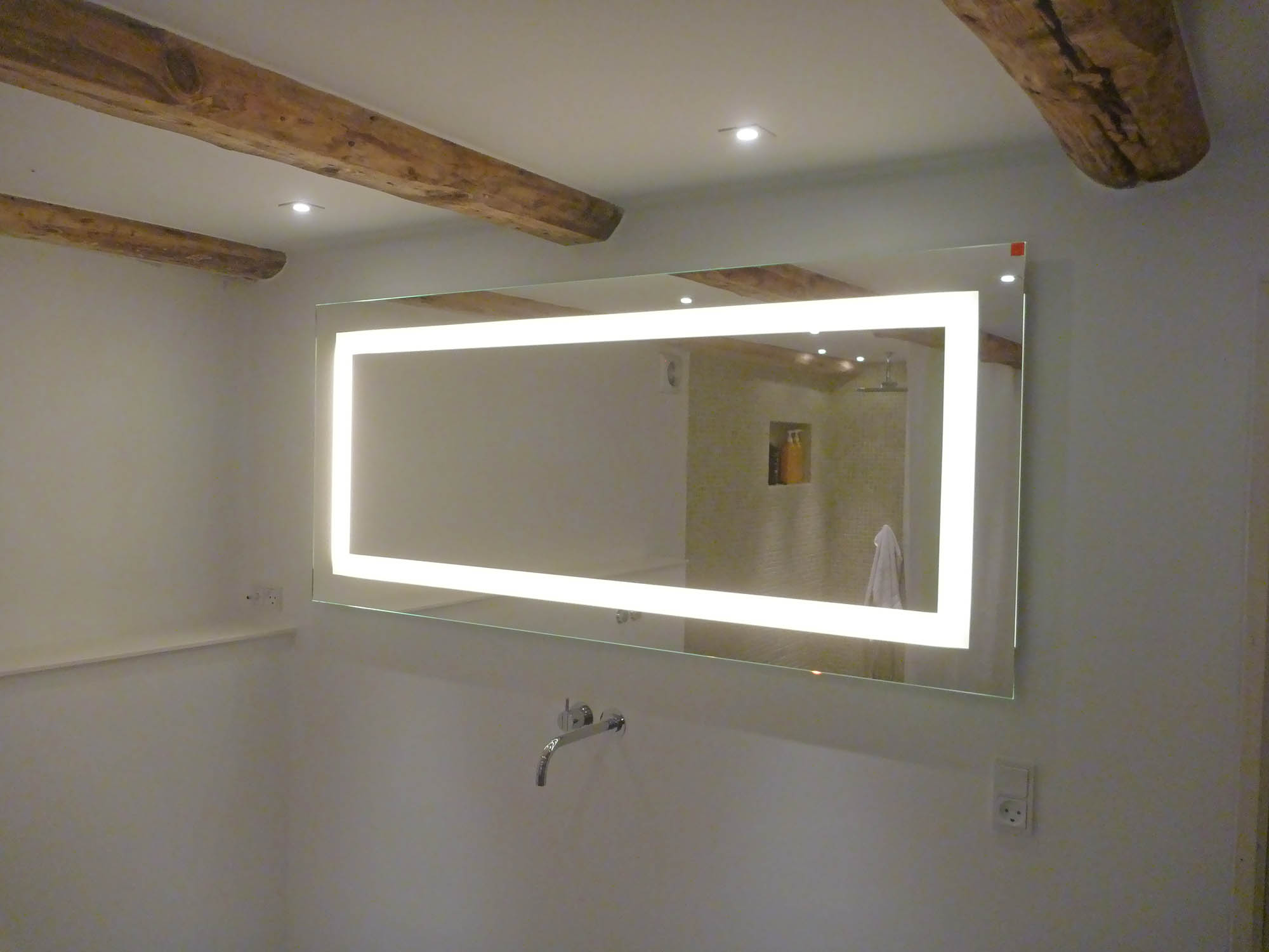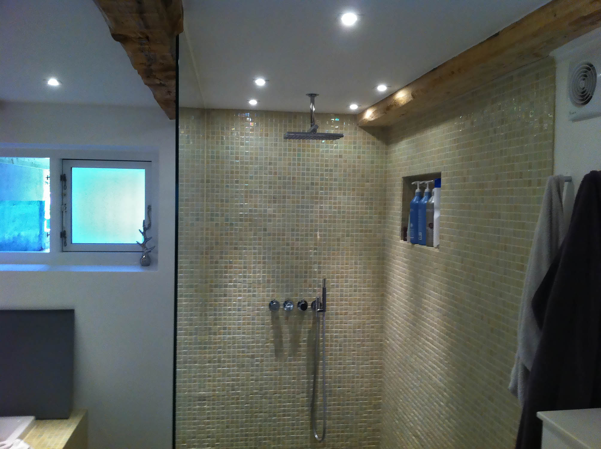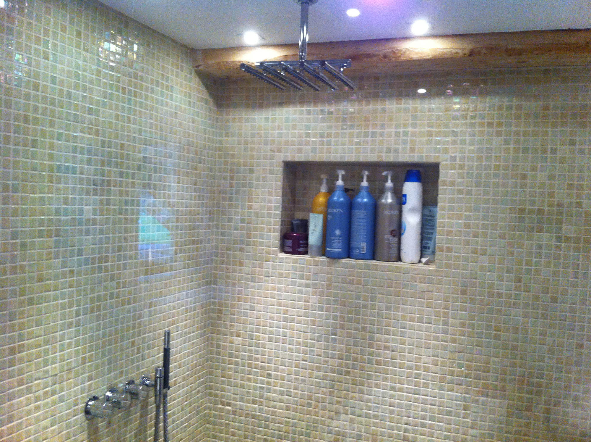 Gammelt tørrerum i kælder omdannet til stort luksus-badeværelse. Bruseniche med både Rainshower-brus håndholdt bruserhoved. Indbygget jacuzzi og væghængt toilet. Alt samme i bedste kvalitet!