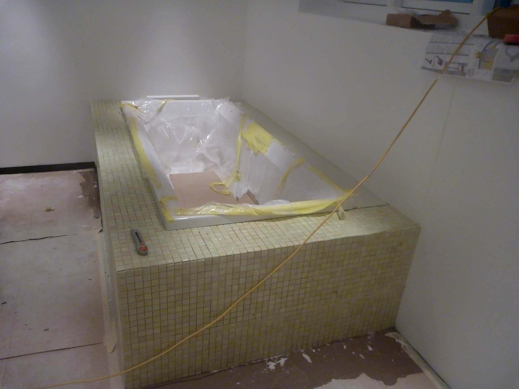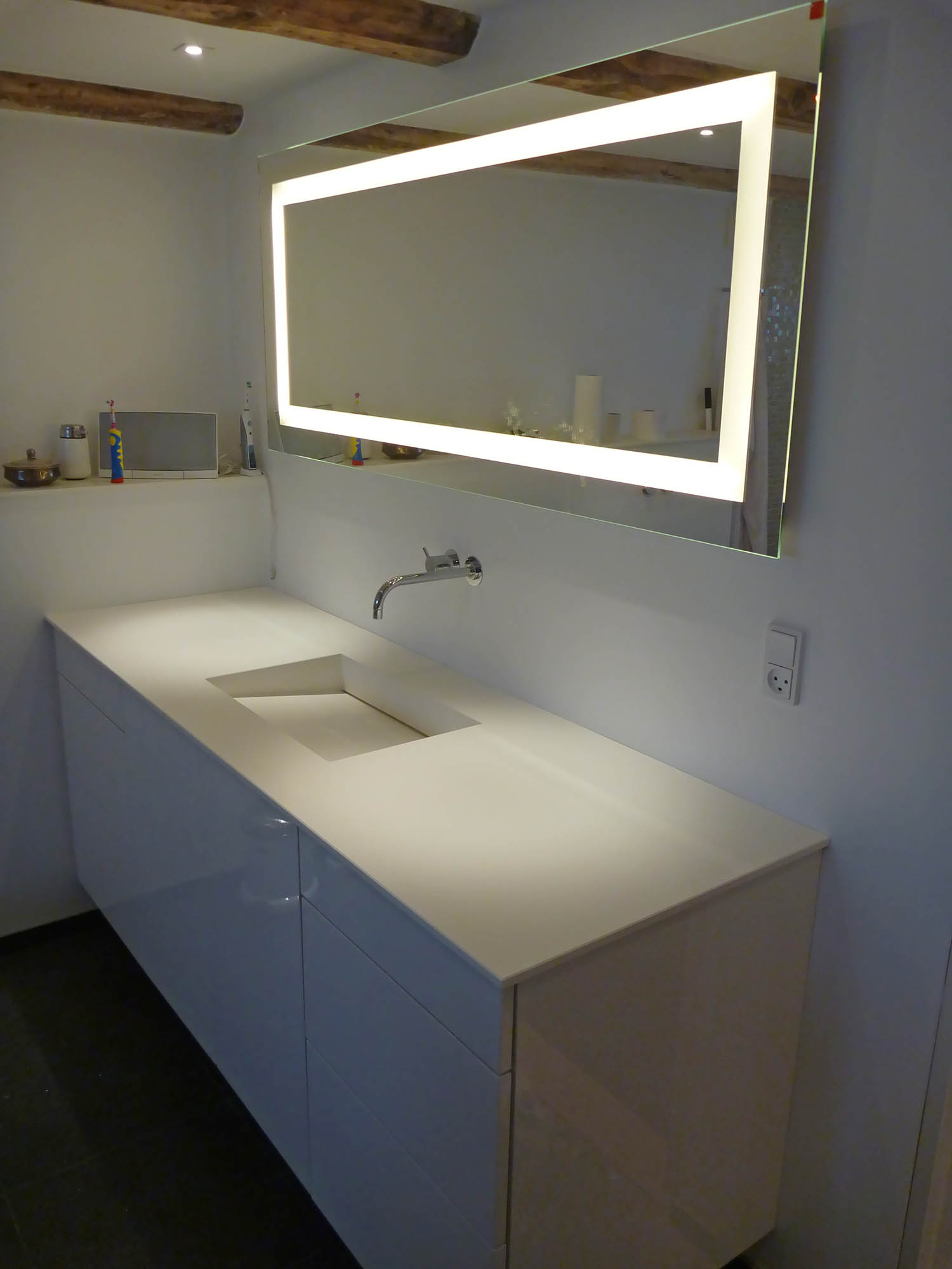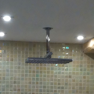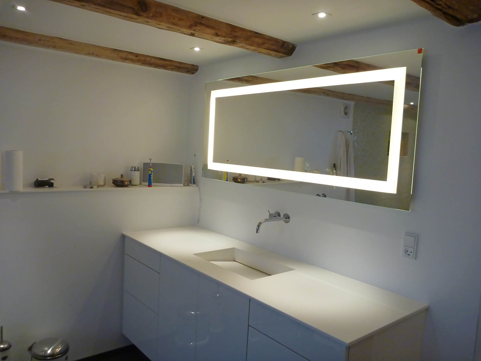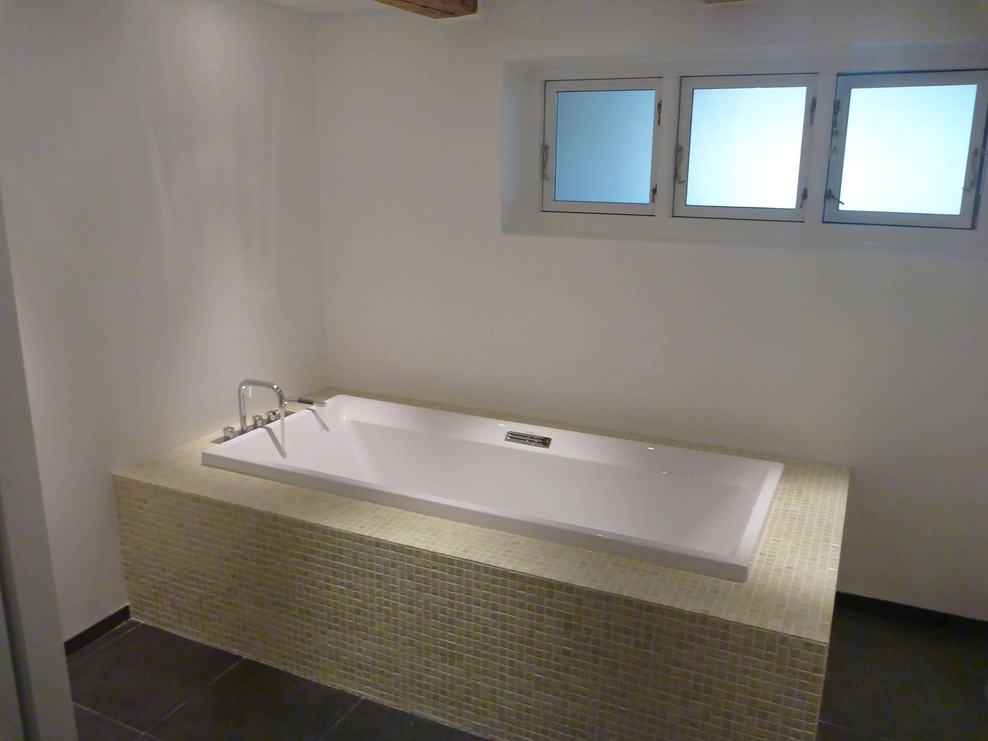 Gammelt tørrerum i kælder omdannet til stort luksus-badeværelse. Bruseniche med både Rainshower-brus håndholdt bruserhoved. Indbygget jacuzzi og væghængt toilet. Alt samme i bedste kvalitet!