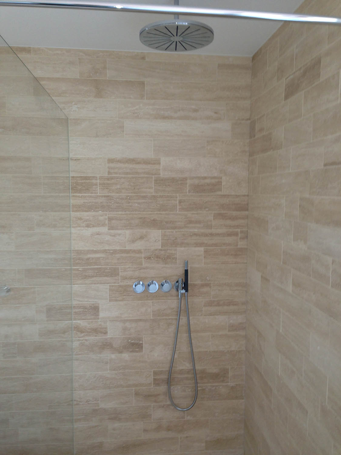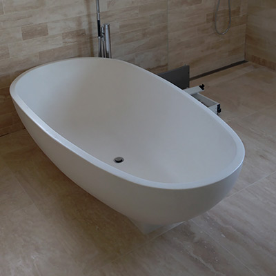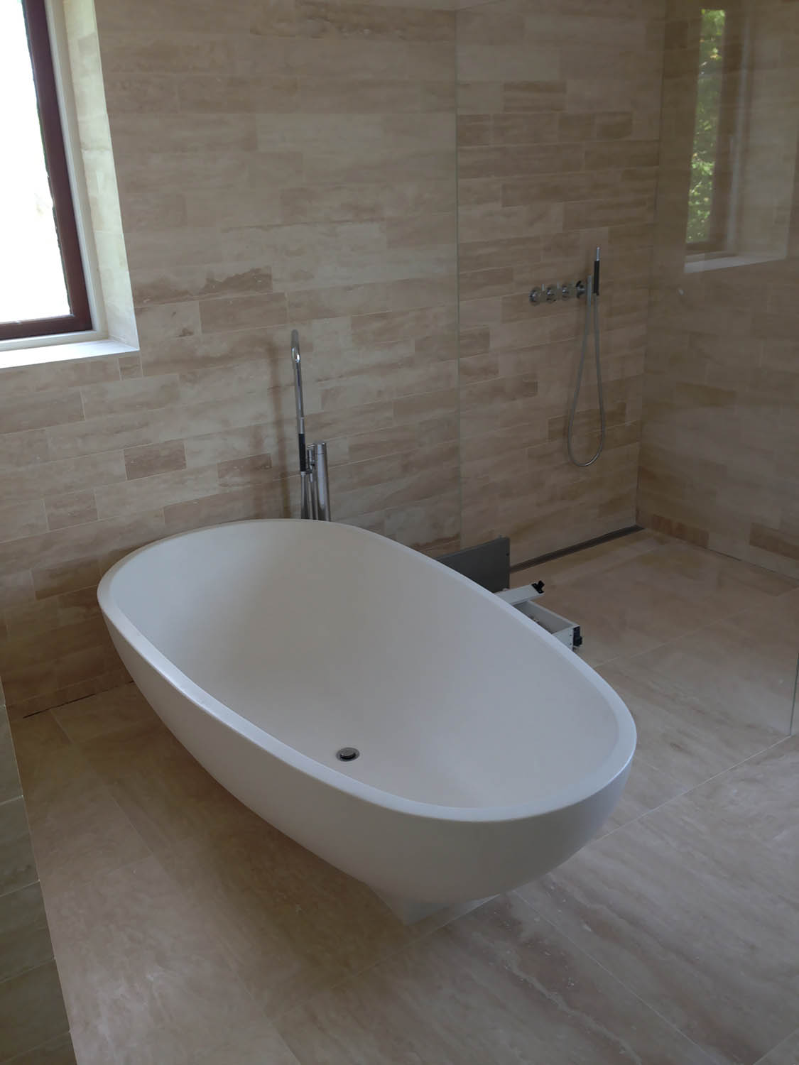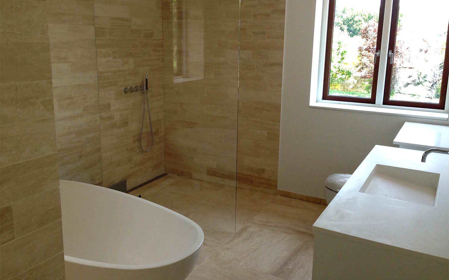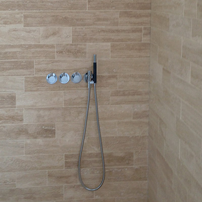Renovering af badeværelse i middelhavsstil med eksklusiv italiensk marmor og speciel-indkøbt sanitet og armaturer. Bemærk at prisen er uden karbad og blandingsbatterier.