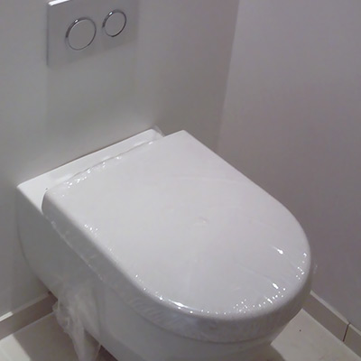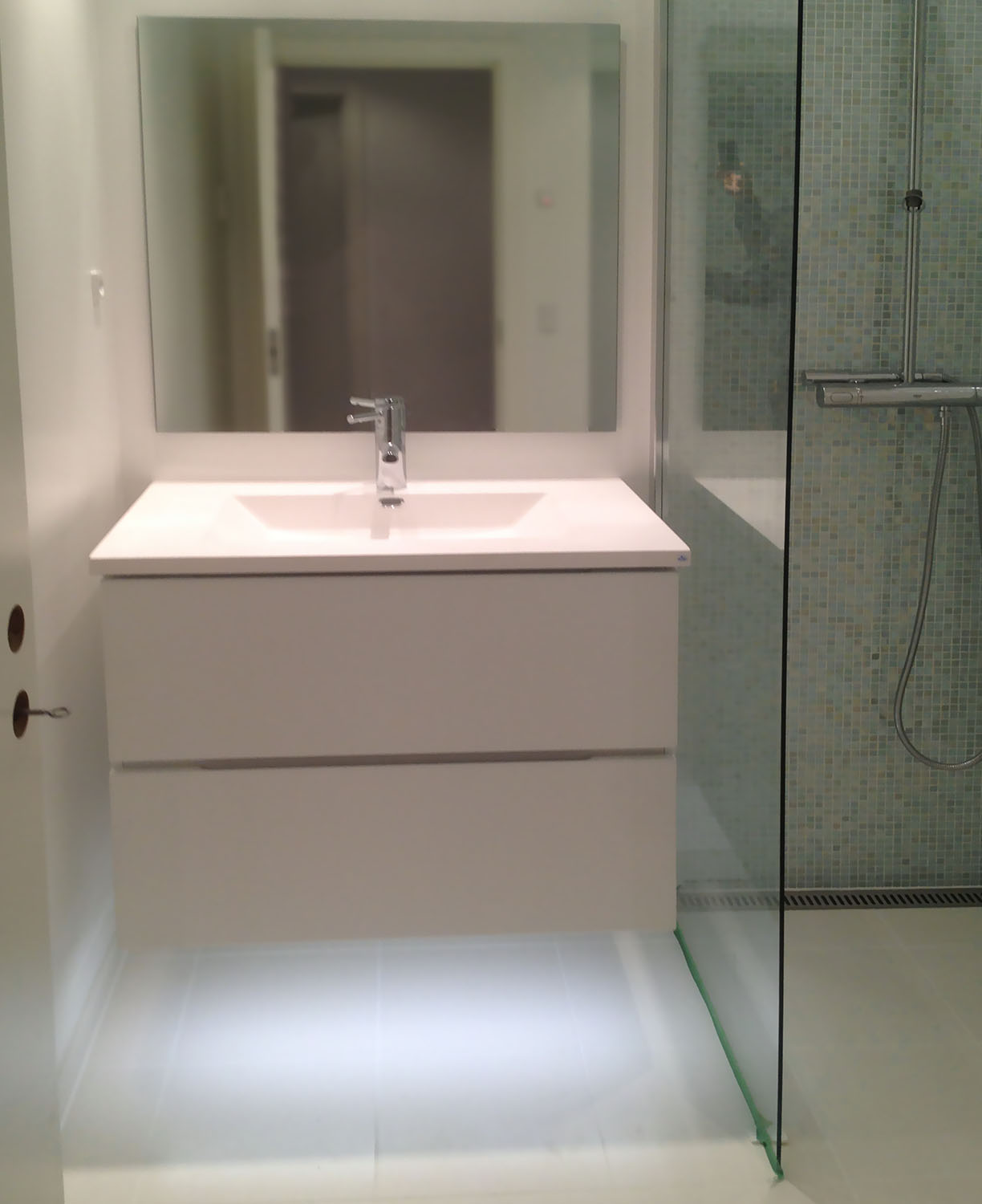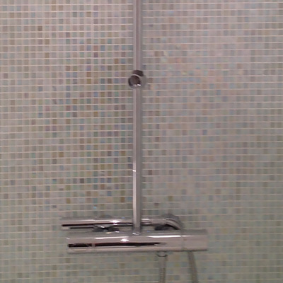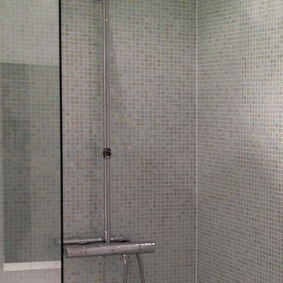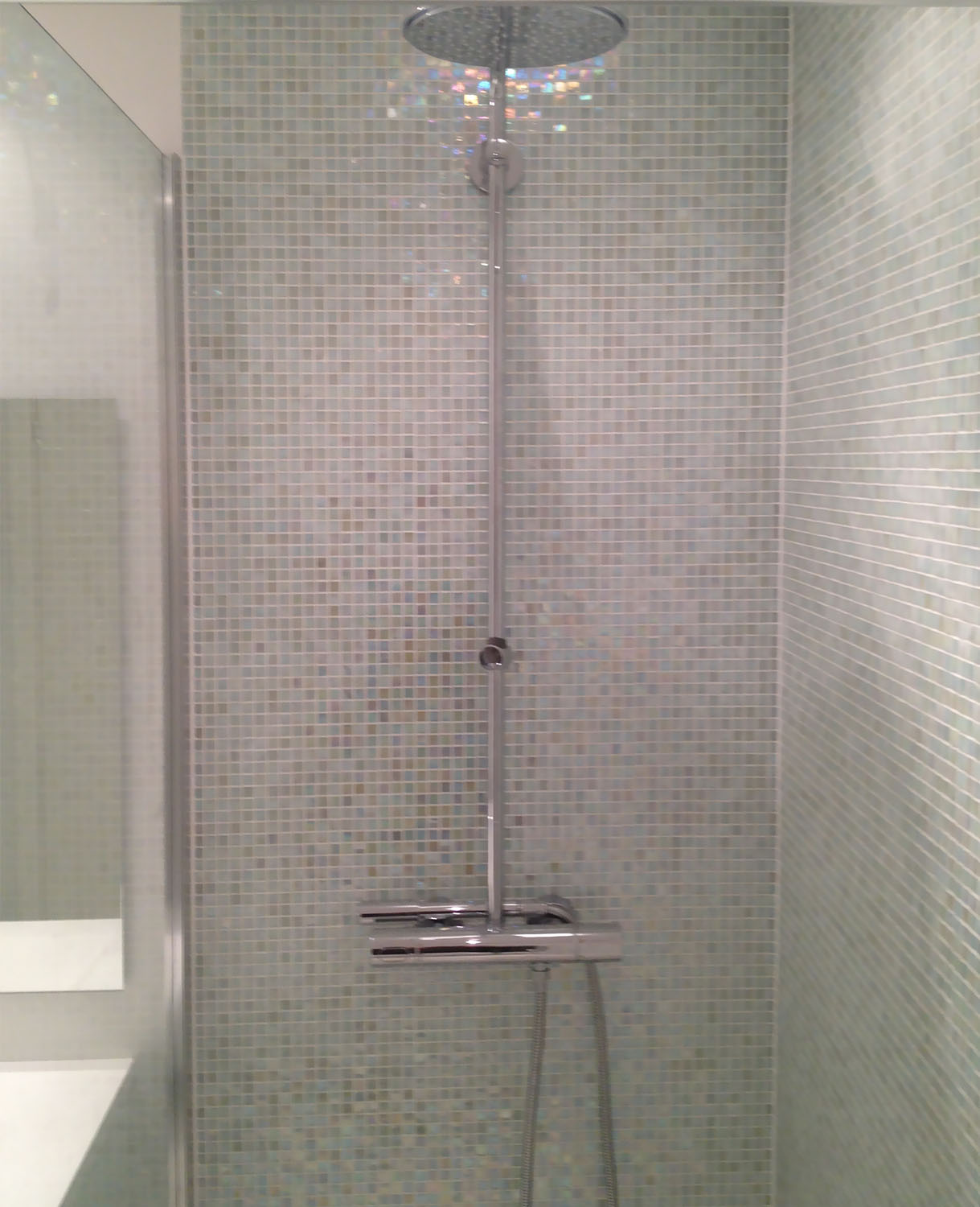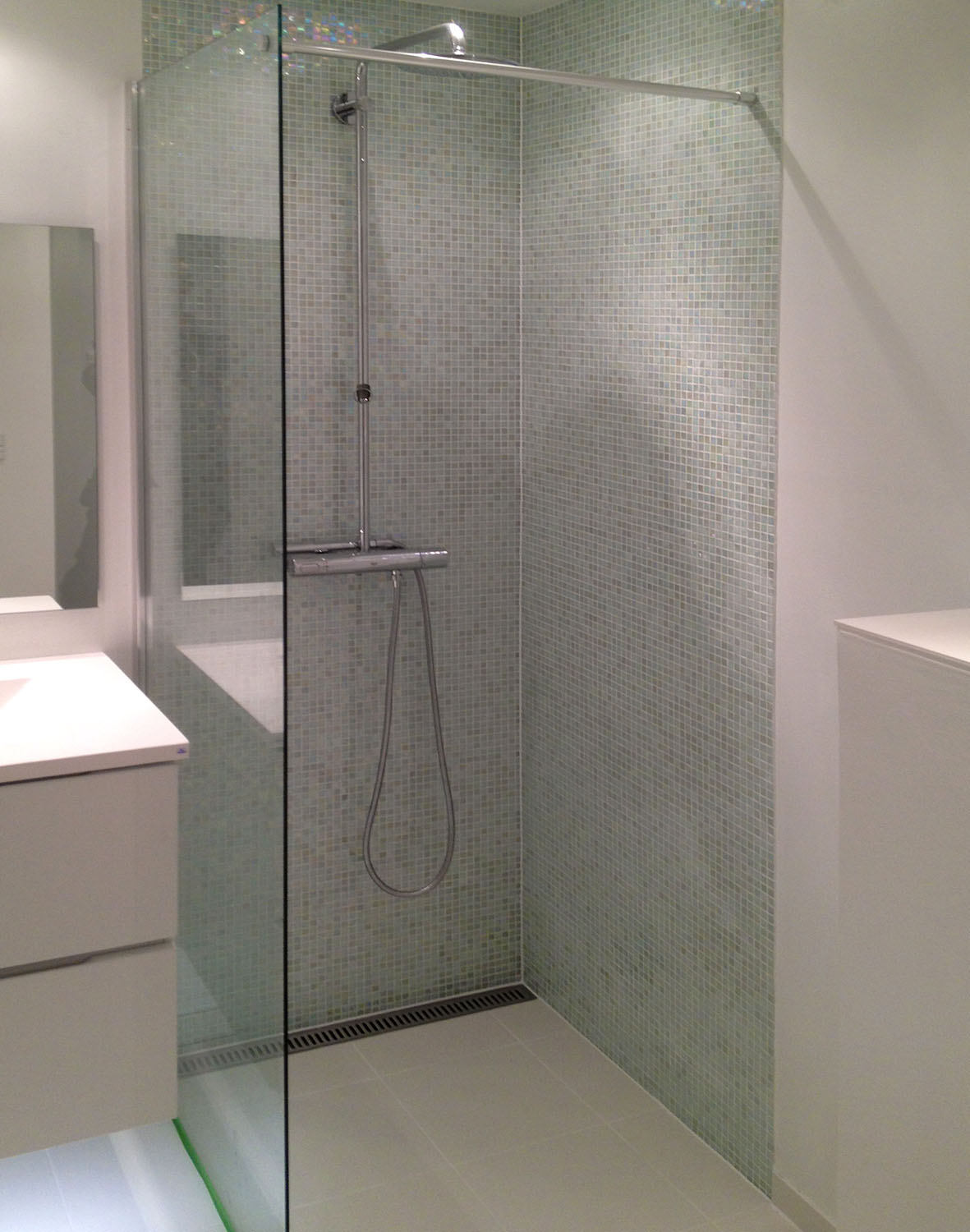 Total-renovering af badeværelse forbindelse med større ombygning af resten af huset. Brusenichen med glasvæg, rainshower brus og elegant mosaik.